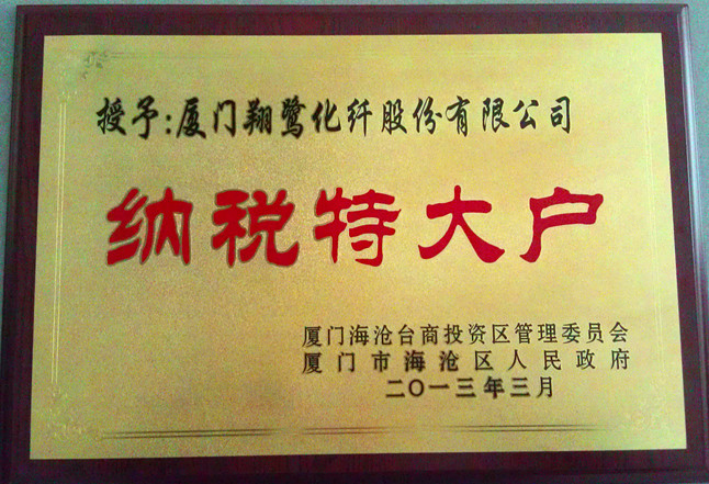 為表彰各企業(yè)對提升海滄區(qū)經(jīng)濟綜合競爭力,增加財政收入,促進社會全面進步作出的重要貢獻,海滄區(qū)召開2012年度納稅大戶暨創(chuàng)建商標品牌表彰大會,授予我司“納稅特大戶”稱號,并獎勵10萬元。
